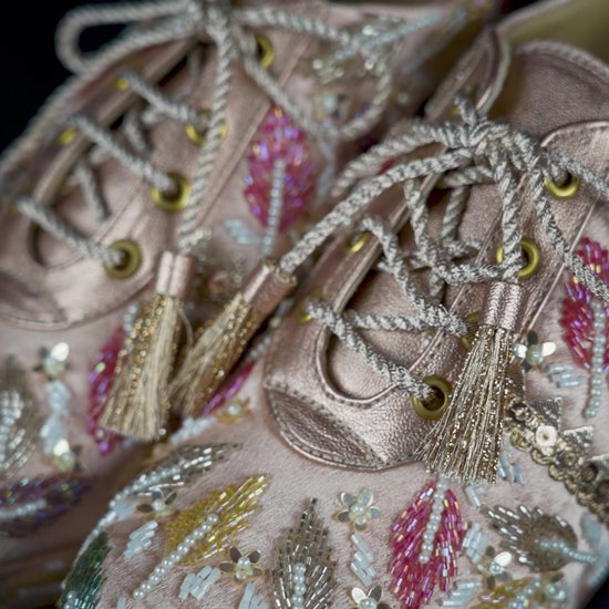 Step into standout style with these beautifully crafted wedge sneakers, designed to blend comfort with high-fashion artistry. Set on a subtle platform wedge, this shoe features an elegant blush base covered in intricate multicolor beadwork and sequined leaf motifs. Each detail is meticulously stitched to create a textured, shimmering design that catches the light from every angle.
