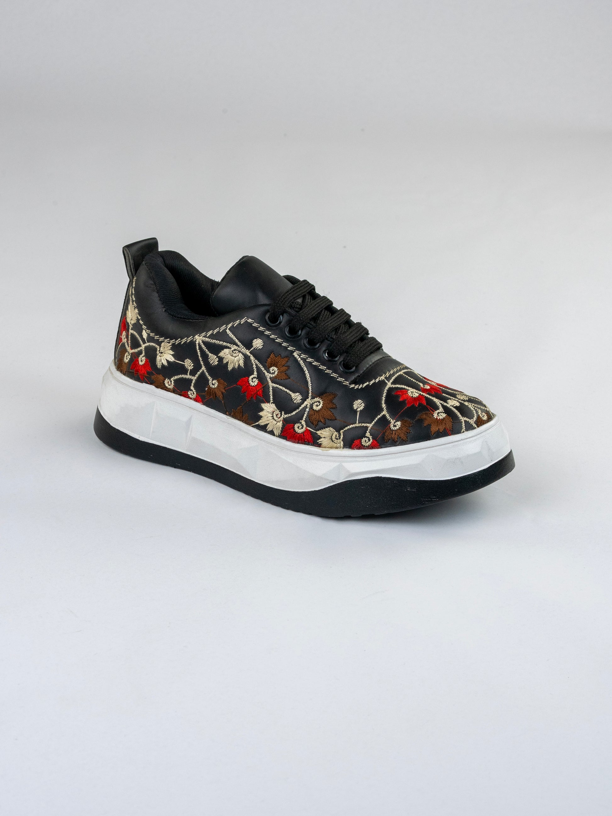 Black Noir Bloom Sneakers-Intricate Floral Embroidery In Red, Brown, And Ivory threads