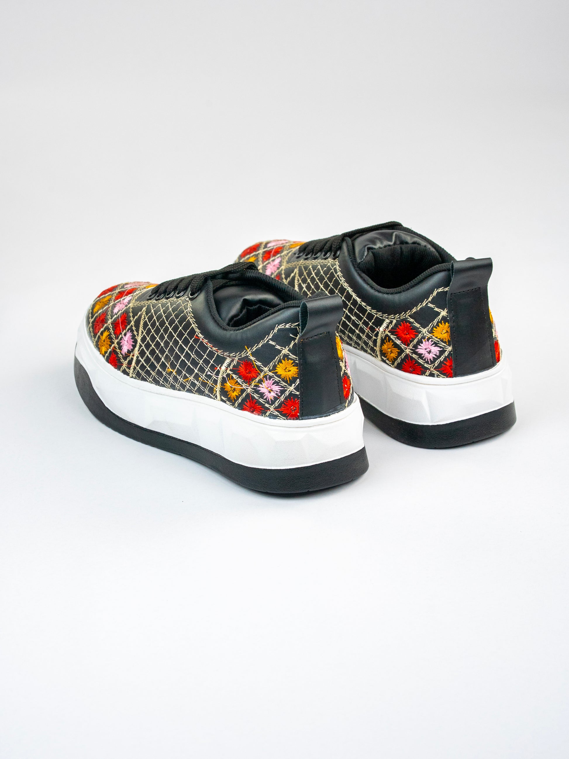 Black Royale, Glossy Embroidered Sneakers – Multicolour Phool Jaal Design