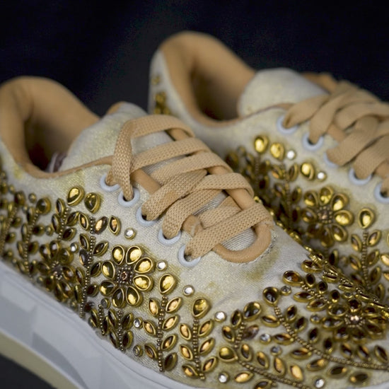 Step into luxury with these women’s gold embellished sneakers, designed to elevate any outfit with bold sparkle and artisanal craftsmanship. Featuring a cream-gold upper adorned with intricate metallic beadwork and leaf-shaped embellishments, this statement sneaker brings a glamorous twist to everyday fashion.