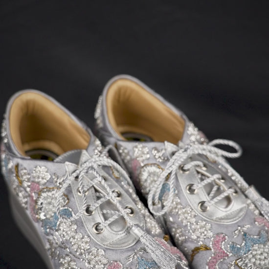 Elevate your style with these sophisticated women’s embroidered silver platform sneakers — a gorgeous blend of modern streetwear and elegant craftsmanship. With a shimmering silver base and meticulously applied multicolored embroidery and bead detailing, this shoe offers a refined yet bold look that catches attention from every angle.