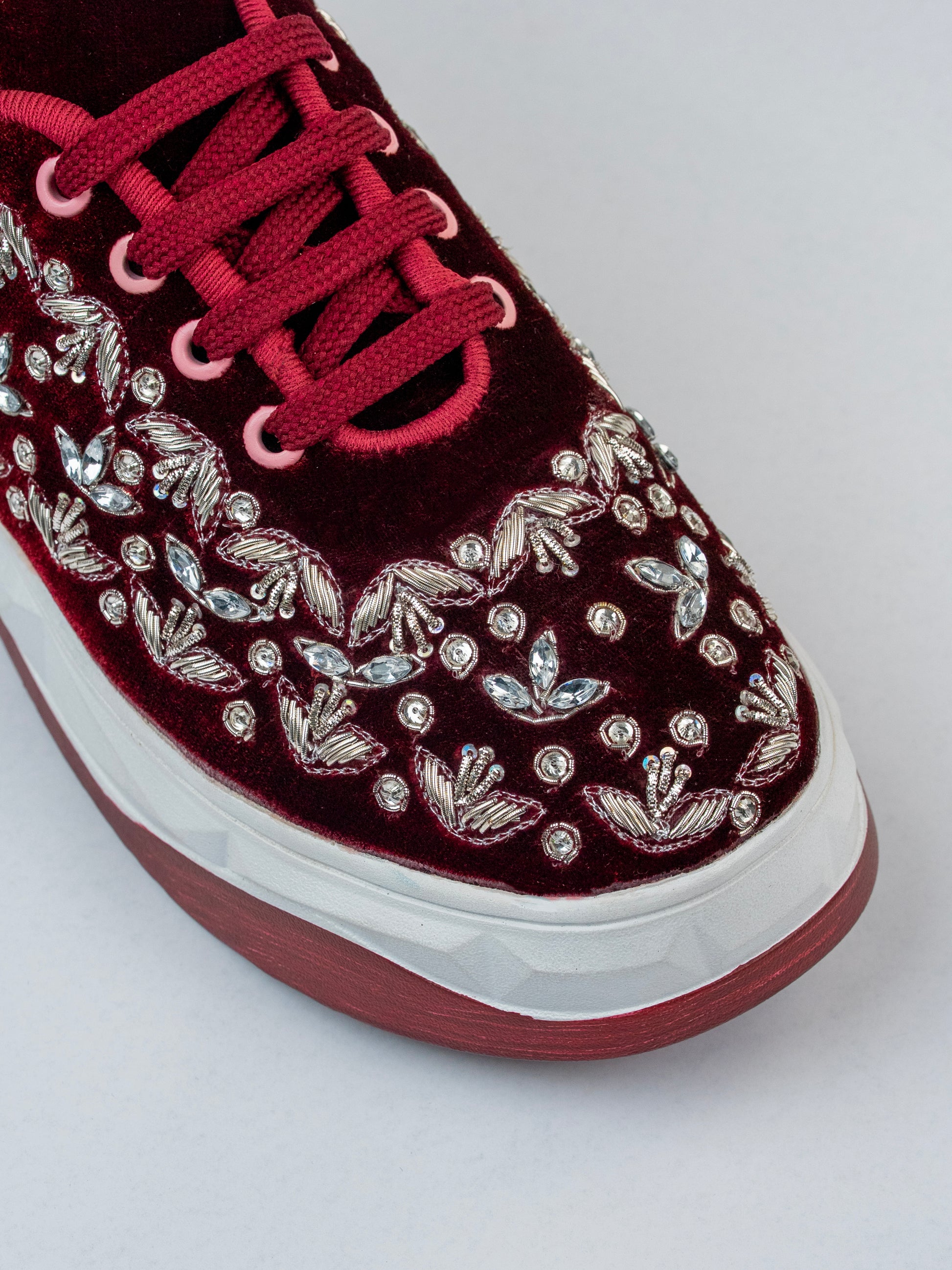 Dark Maroon Velvet Sneakers – Shine in Style, Walk in Comfort