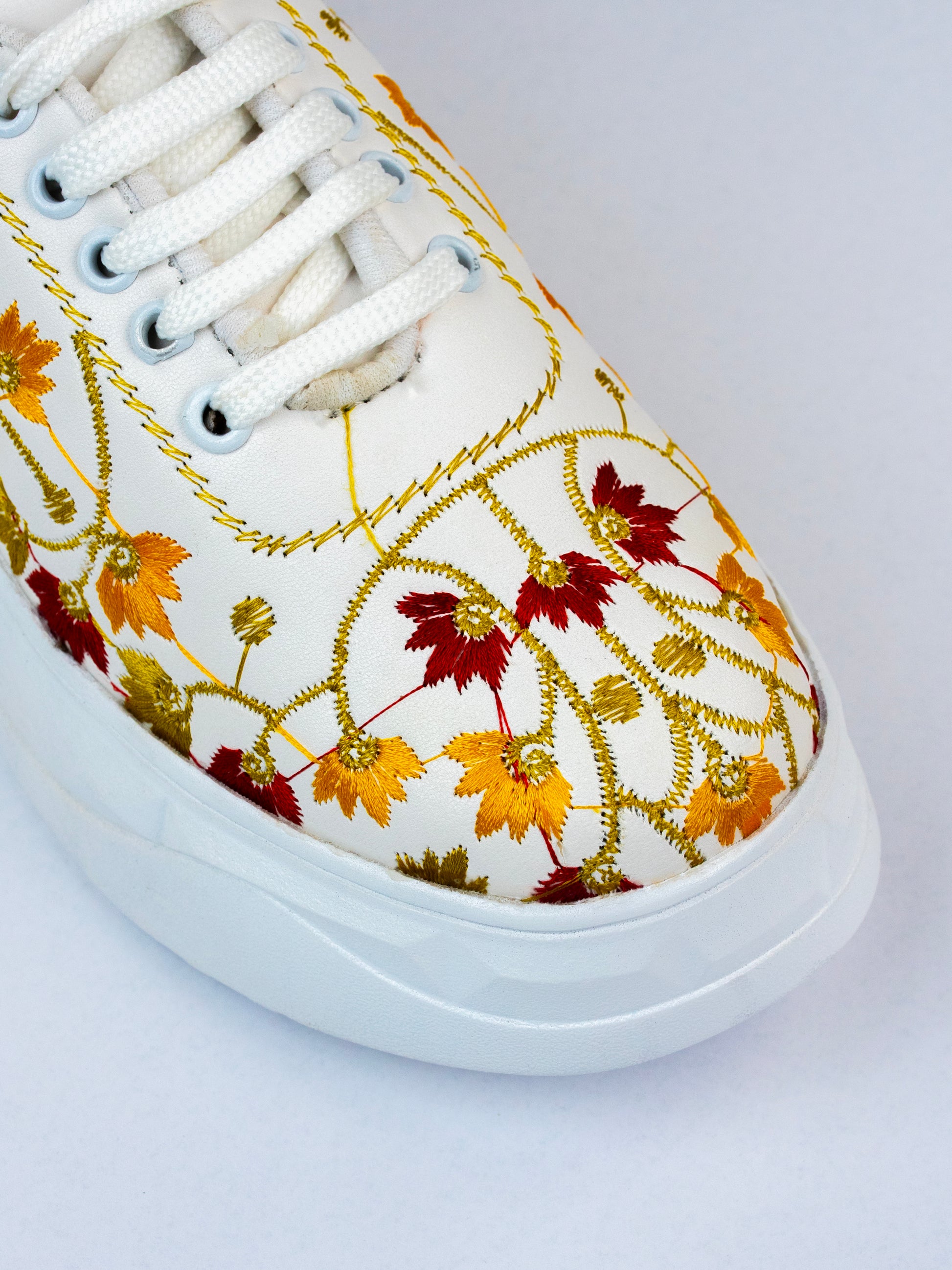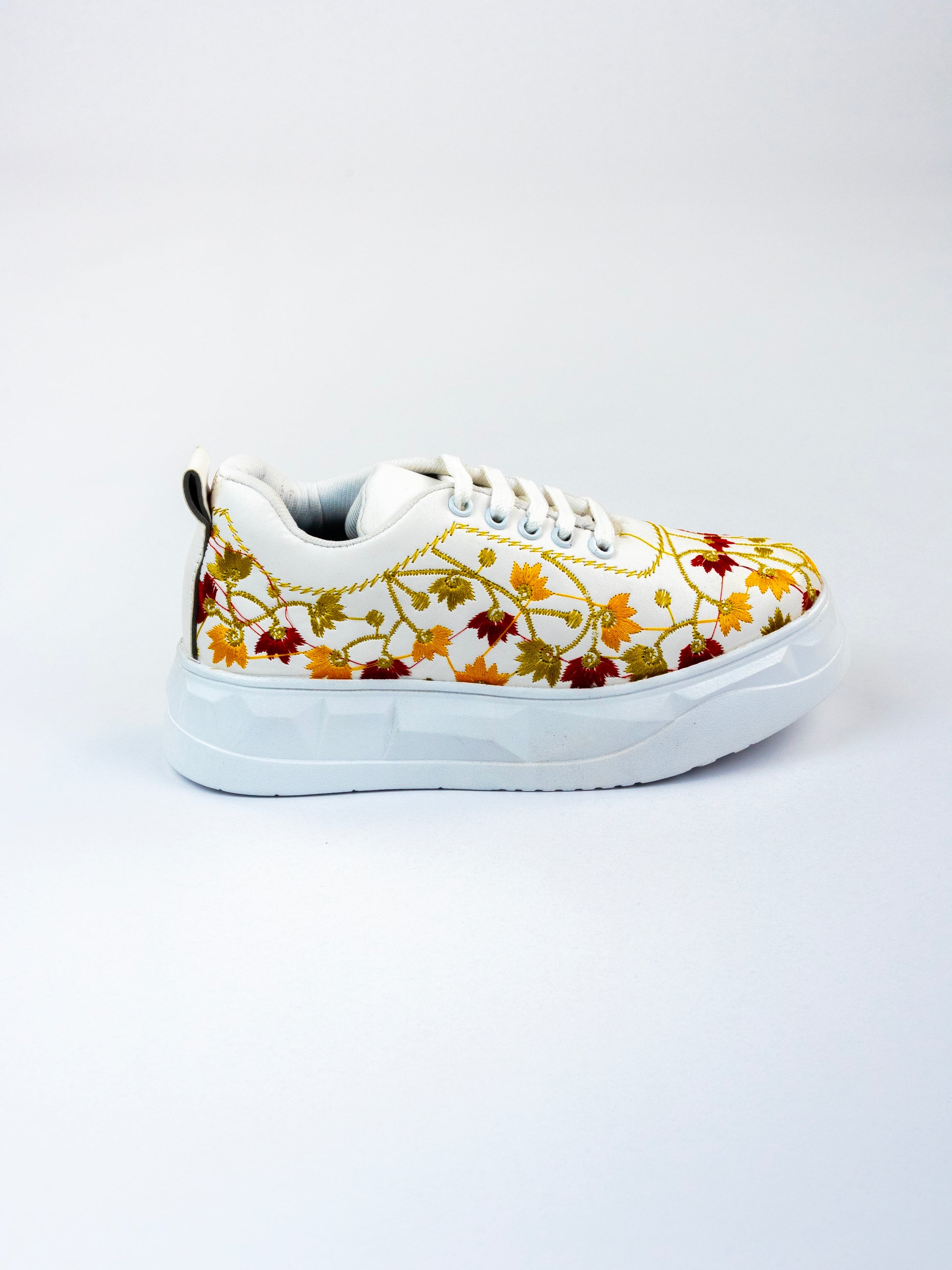 Add a touch of handcrafted elegance to your everyday style with the Ivory Blossom White Mechine-Embroidered Sneakers. Built on a premium ivory-white leather base, these sneakers feature delicate handcrafted floral embroidery in maroon, mustard yellow, and antique gold threads arranged in an elegant vine pattern. The artistic detailing makes each pair truly unique.