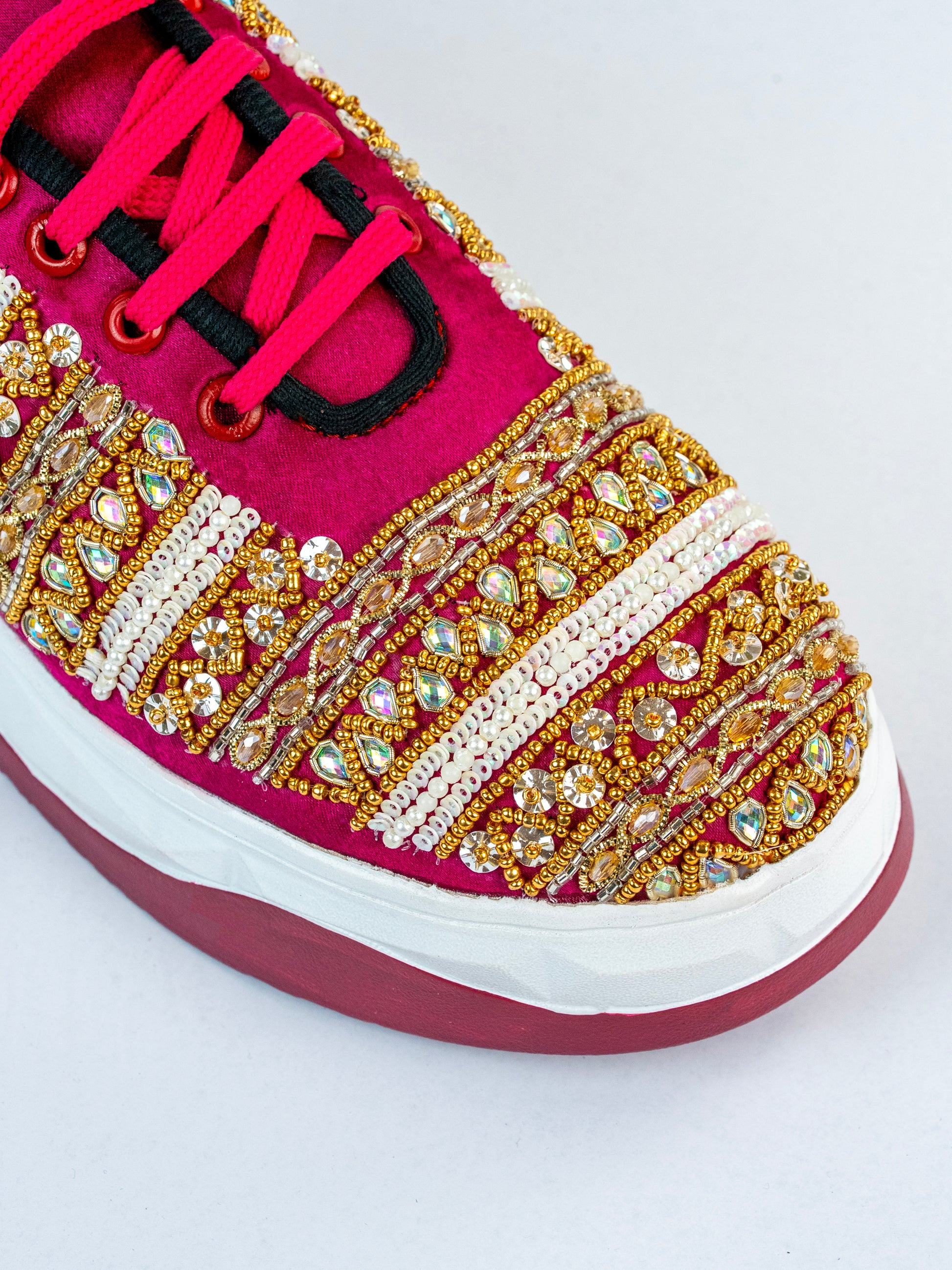 Made with soft satin in a rich rani pink shade, the upper is beautifully decorated with golden beads, white sequins, pearls, silver kardana, and golden crystal stones that create a sparkling, graceful shine with every step. Whether you pair it with ethnic, western, or Indo-fusion outfits, this footwear adds sophistication effortlessly.