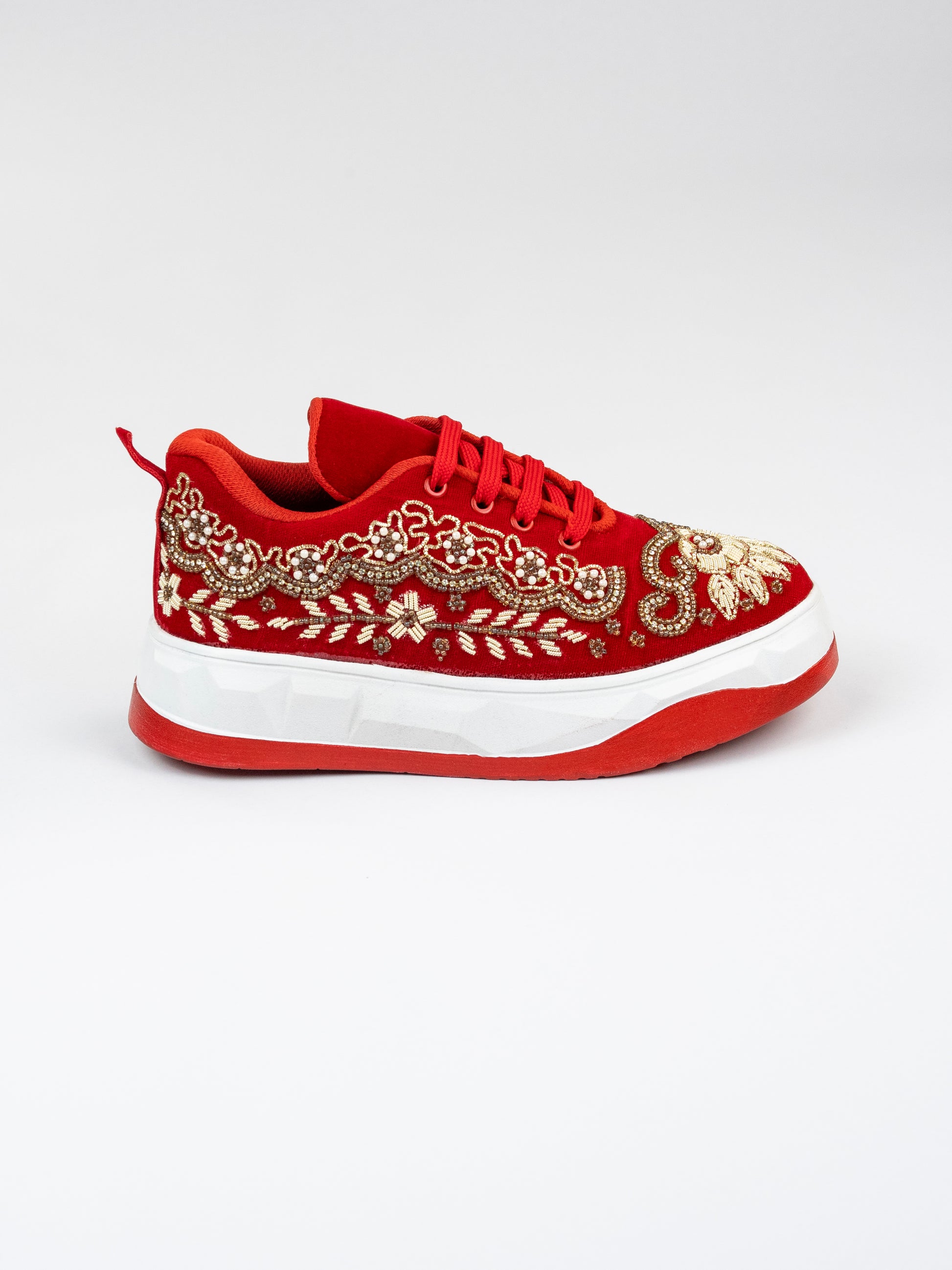 Jhalak, Embellished Red Velvet Sneaker – Belpatti Work, Stones & Zari Detailing