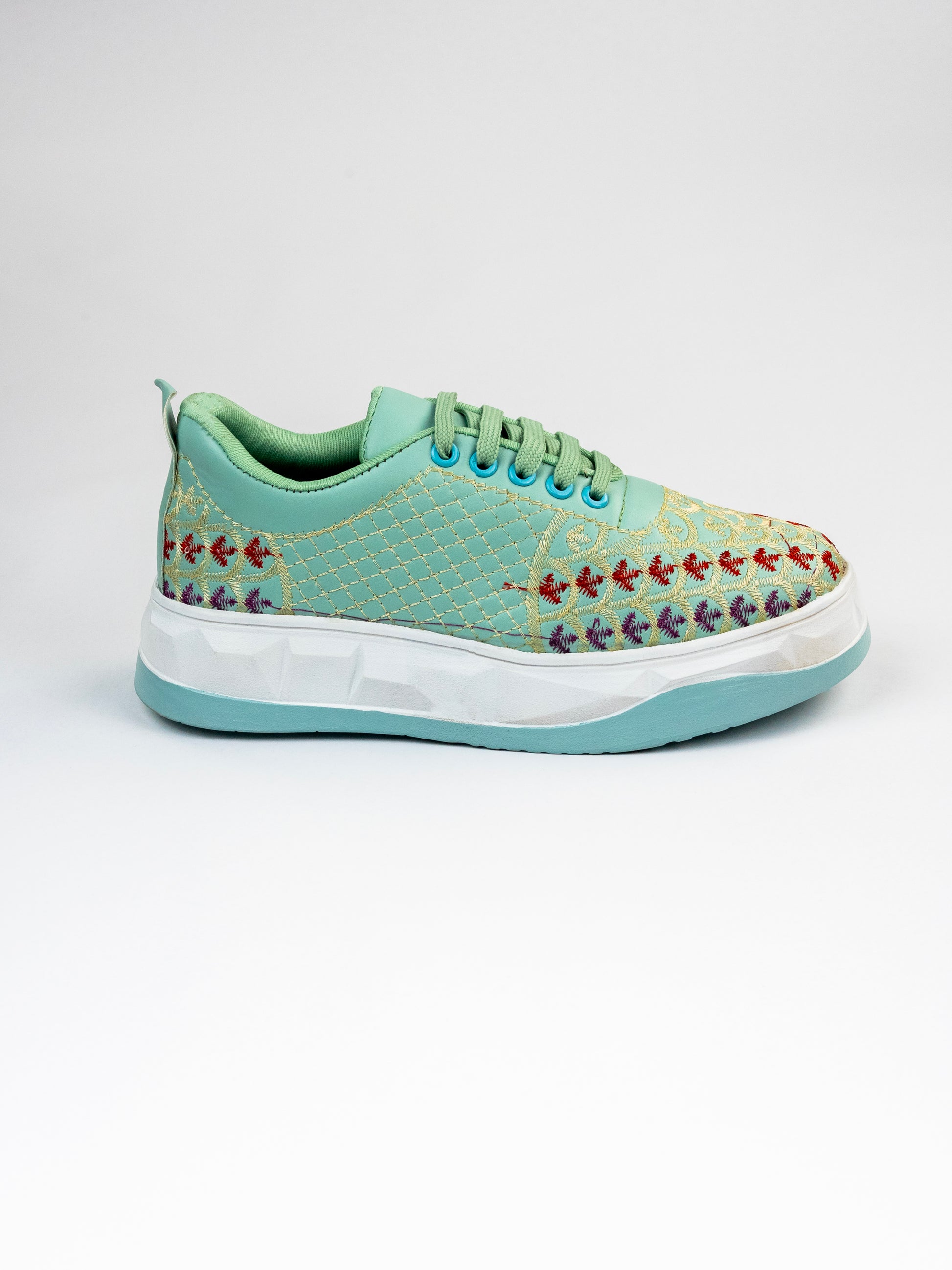 Mint-Green,Matte-Gloss Embroidered Sneakers – Scallop Floral Jaal Design