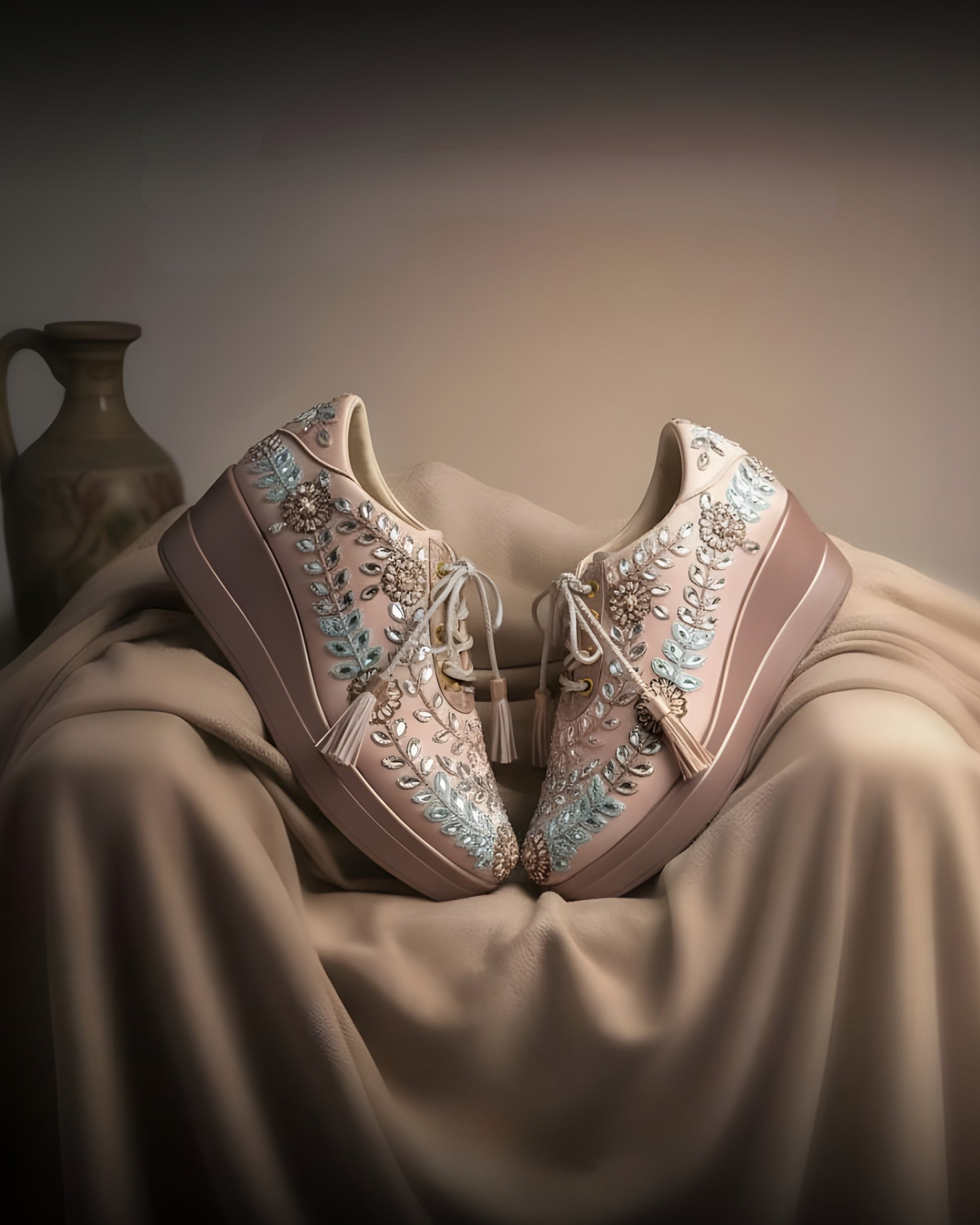 Step into effortless festive elegance with our Rose Gold Embellished Wedge Sneakers, crafted for women who adore luxurious ethnic detailing paired with modern comfort. The soft satin rose-gold base is intricately adorned with mirror work, hand-beaded floral motifs, and thread leaf embroidery—creating a sophisticated, glamorous look perfect for weddings and celebrations.