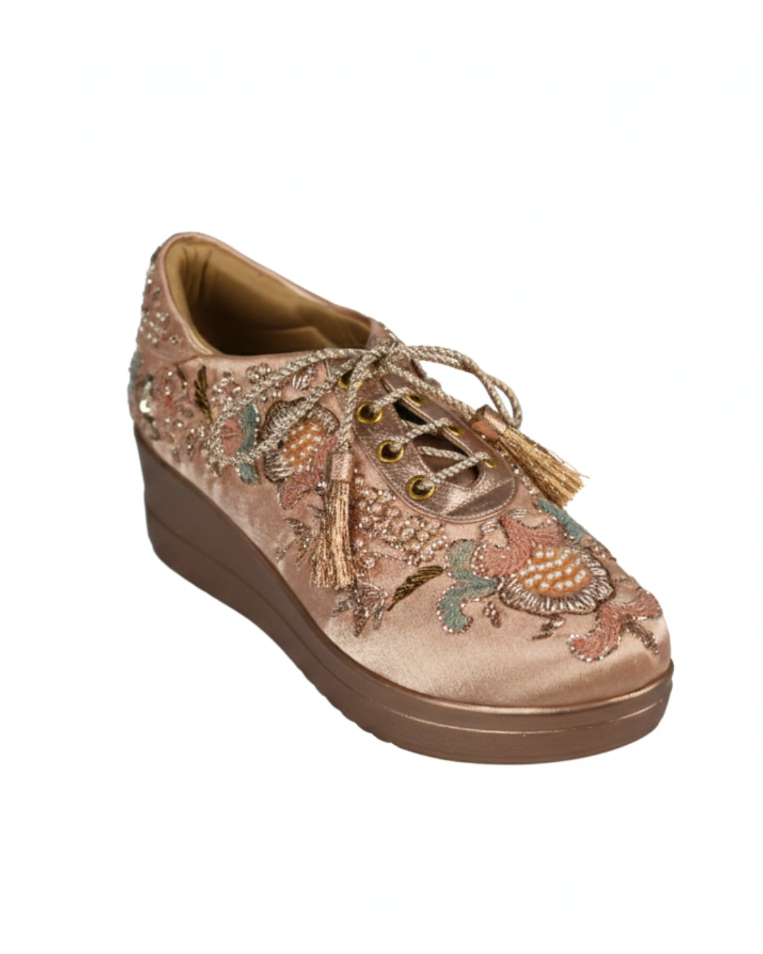 Step into elegance with our Rose Gold Pearl & Sequin Embroidered Wedge Sneakers, crafted for women who love the perfect fusion of traditional artistry and modern comfort. Made on a premium satin rose-gold base, this exquisite pair features hand-embroidered 3D floral motifs, pearl bead clusters, sequins, and delicate pastel threadwork—creating a luxurious and timeless festive look.