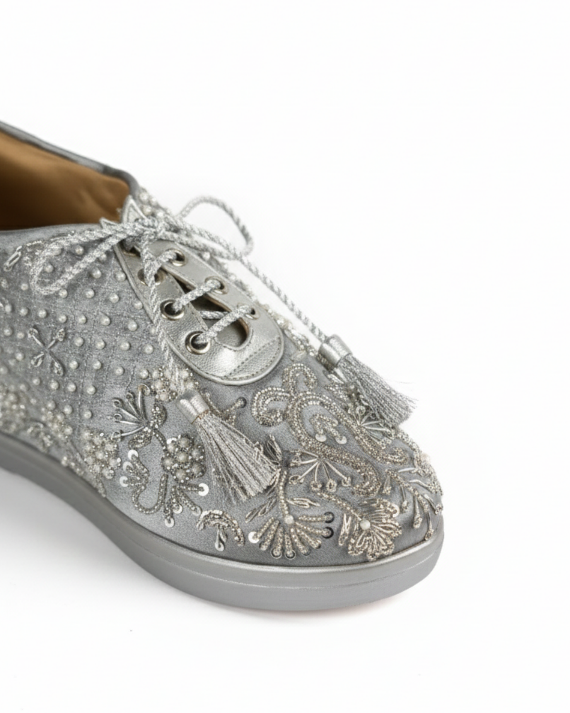 Step into refined elegance with these beautifully hand-embellished grey platform sneakers. Designed for women who desire both luxury and comfort, this pair blends exquisite craftsmanship with a modern, height-boosting silhouette—perfect for festive occasions, wedding functions, and sophisticated everyday wear.